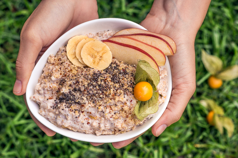 - Final abschmecken, nach Geschmack noch etwas mehr würzen und dekorieren (z.B. mit Nüssen und Samen nach Wahl sowie frischem Obst).