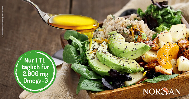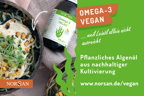 Um den täglichen Bedarf an Omega-3-Fettsäuren zuverlässig zu decken, kann die Einnahme eines pflanzlichen Omega-3-Supplements sehr vorteilhaft sein. Ich selbst nehme seit mehreren Jahren täglich das vegane Omega-3-Öl von NORSAN ein, welches reich an den Omega-3-Fettsäuren DHA und EPA ist.
